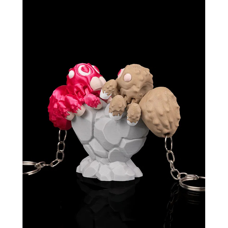 O conjunto apresenta dois chaveiros de aranha articulada, cada um em uma cor distinta, apoiados em uma base decorativa.